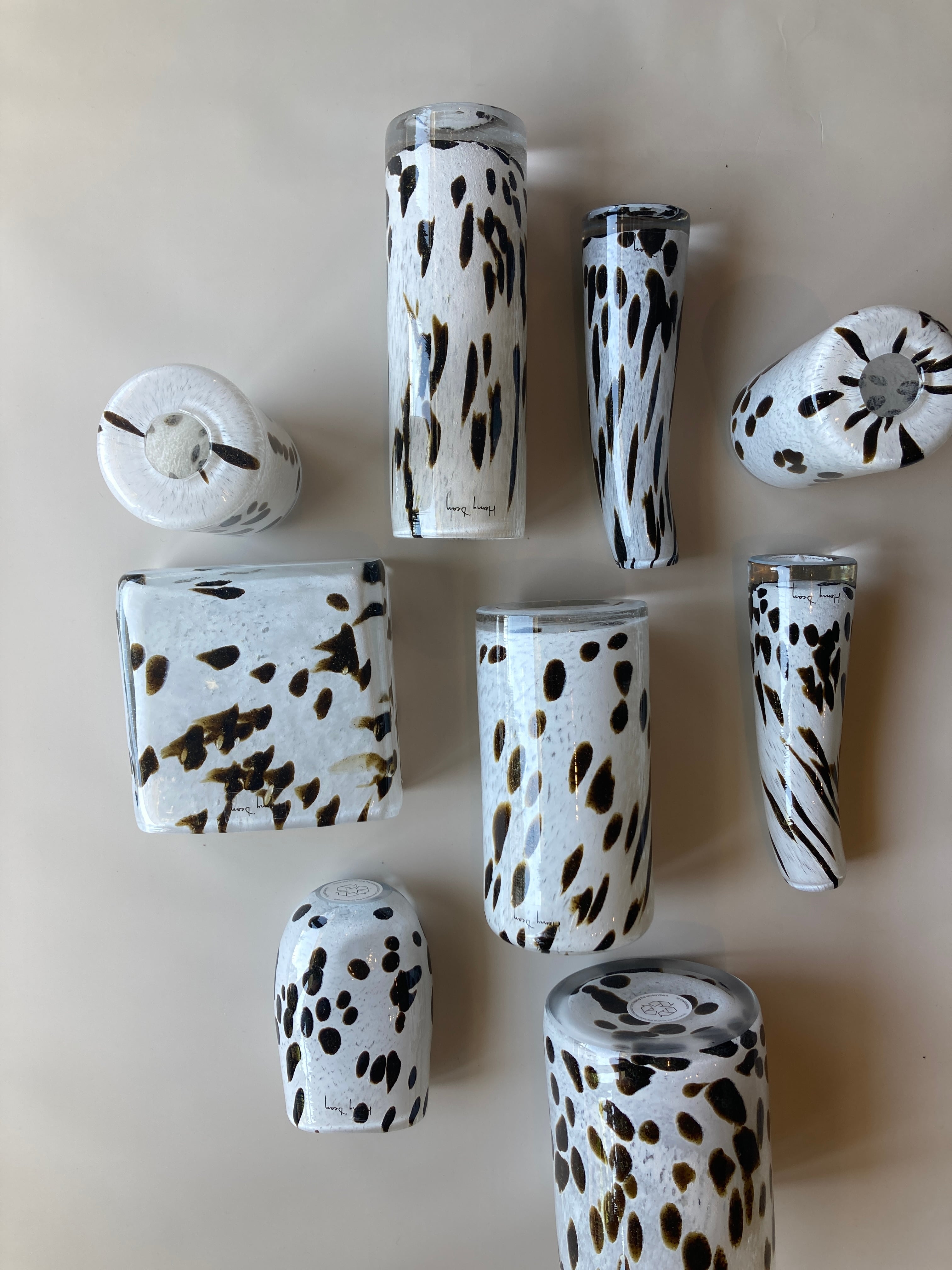 ブランド名 HenryDean 型名 アパルーサ (2025秋冬シーズナルカラー) サイズ 10×13 すべてのカラーが大好評をいただいている2025年秋冬コレクションの中でも突出して人気のあるカラーがこちらの[アパルーサ]です。 アパルーサという品種の馬から着想を得たというこのドットのような斑点模様は黒ではなくこげ茶色でその中にゴールドのラメがちりばめられており見る角度によってキラッと輝きます。 cylinderの高さは13センチ、直径が15センチ、ミニブーケを入れるのに最適なサイズの上、ステムの形がまとまりづらい生花も安定して少量で生けることができます。 HenryDeanの中では珍しいはっきりとした模様のある花瓶ですがドットの色がブラウンであることによって柄のある葉物も、シンプルな生花もちゃんと植物を引き立てくれる花瓶です。 また、複数HenryDeanをお持ちの方でしたら花瓶を並べるときにポイントのカラーとなること間違いなしです。 画像の花瓶はぐるっと一周まんべんなく模様がちりばめられております。 HenryDeanはひとつひとつ個体差の大きな花瓶ですがポポラス植物店のオンラインショッピングは画像の商品がお手元に届きますのでご安心くださいませ。