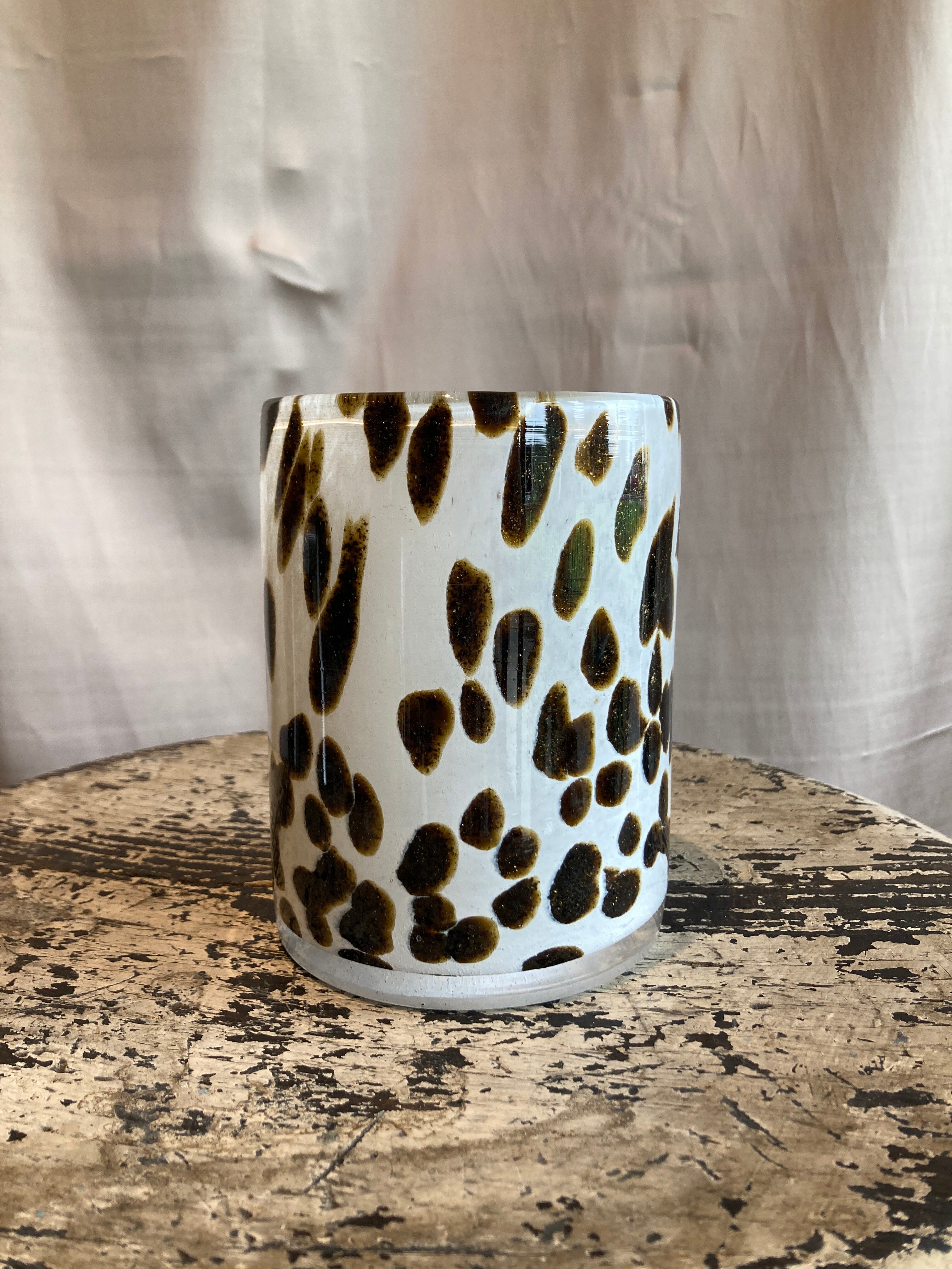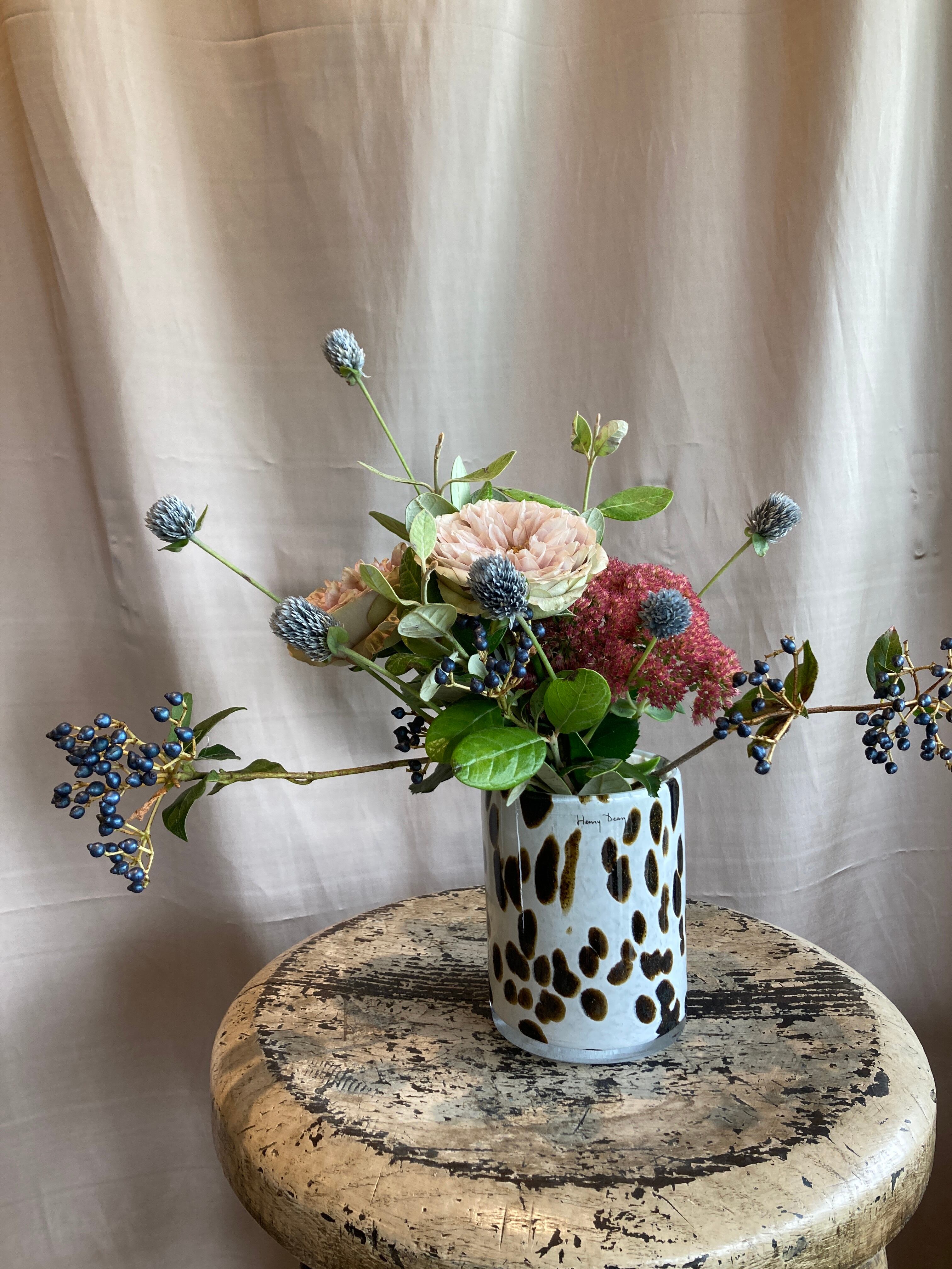 HenryDeanの中では珍しいはっきりとした模様のある花瓶ですがドットの色がブラウンであることによって柄のある葉物も、シンプルな生花もちゃんと植物を引き立てくれる花瓶です。