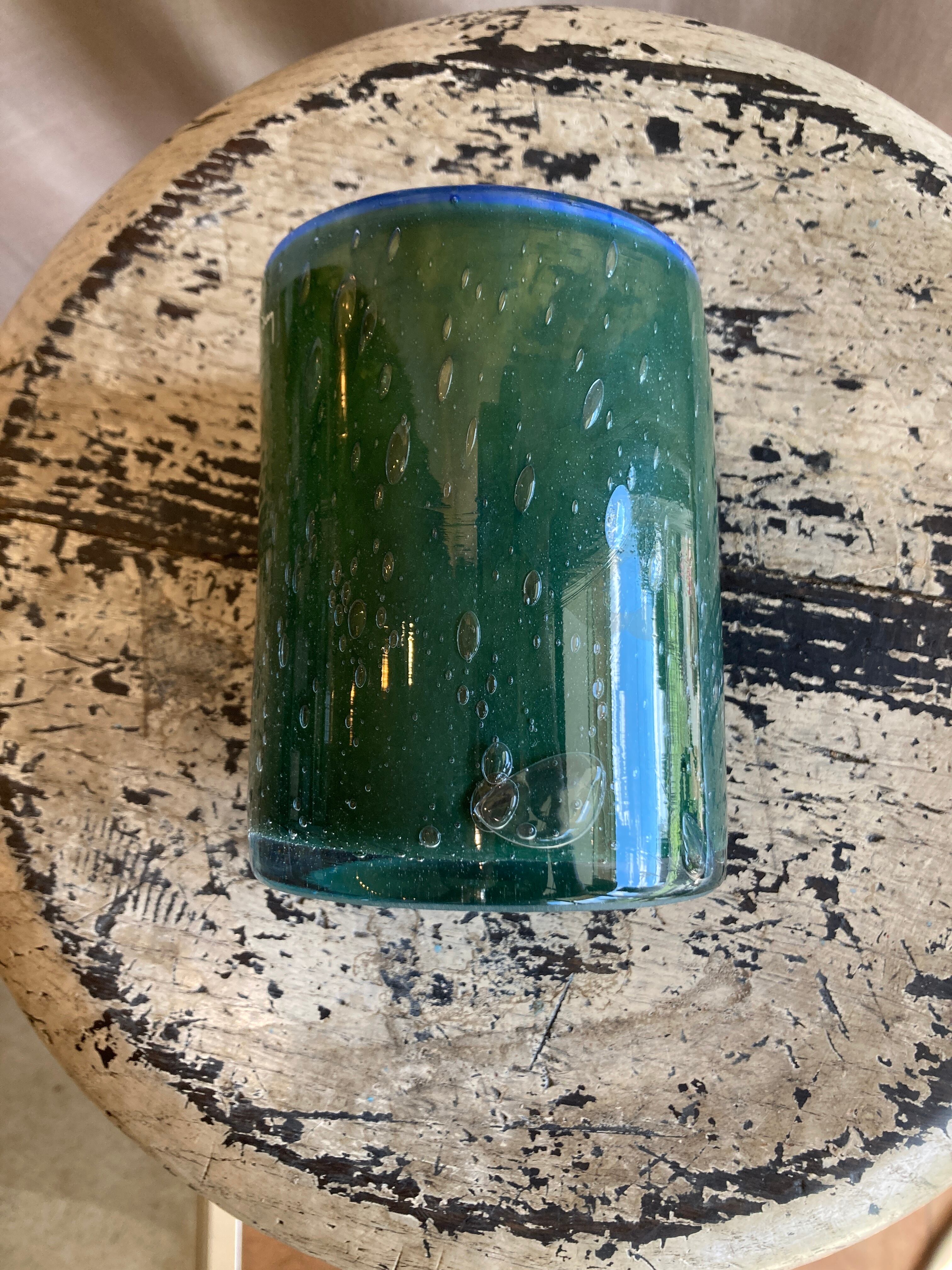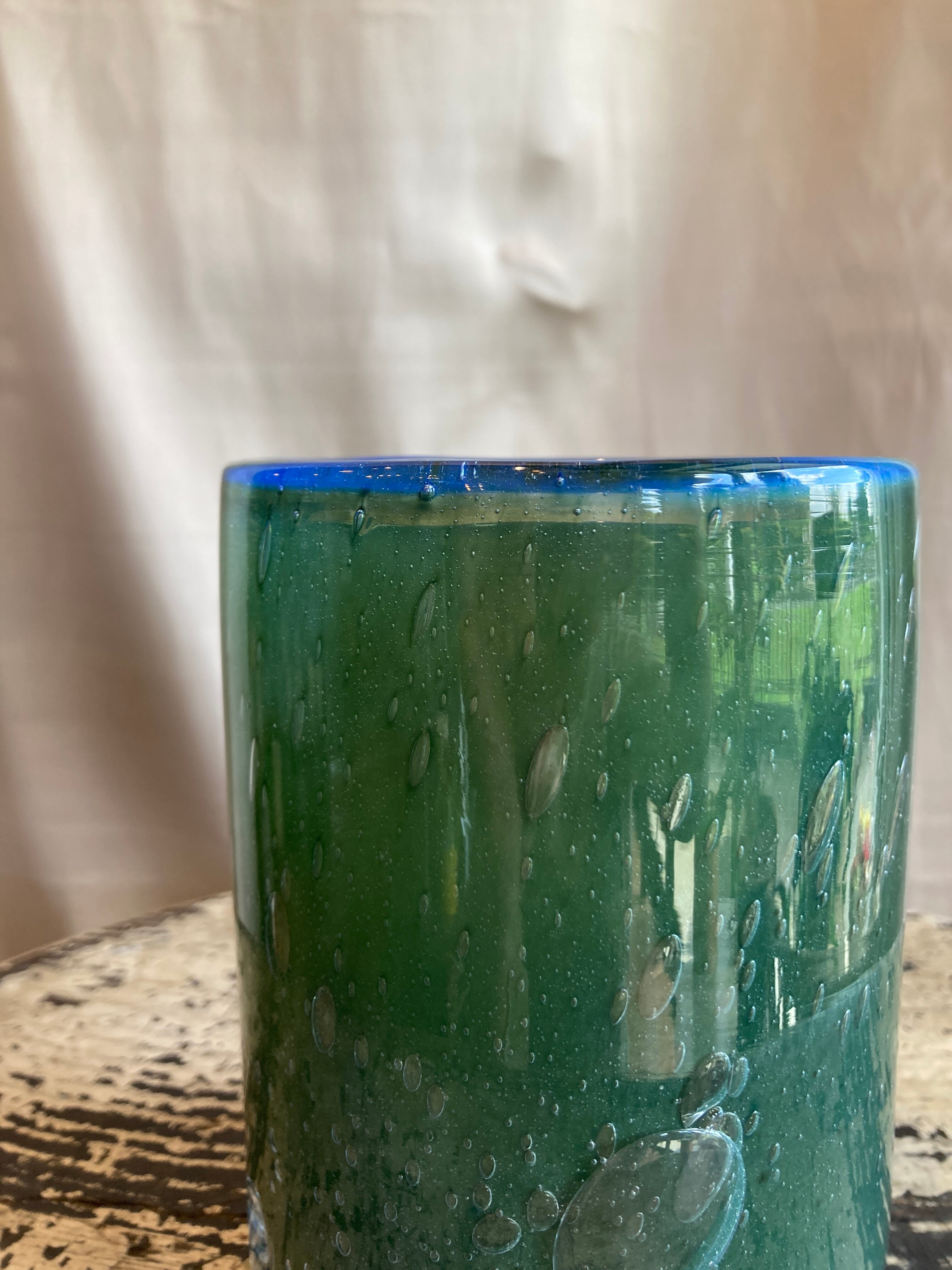作製工程の熱を加えたことによる化学反応により縁の部分に透明感のあるすっきりした青が走ります。この化学反応はどの花瓶にも表れるわけではなく、個体差によります。ご紹介するこのcylinderにははっきりと青い美しいラインが縁取りされています。