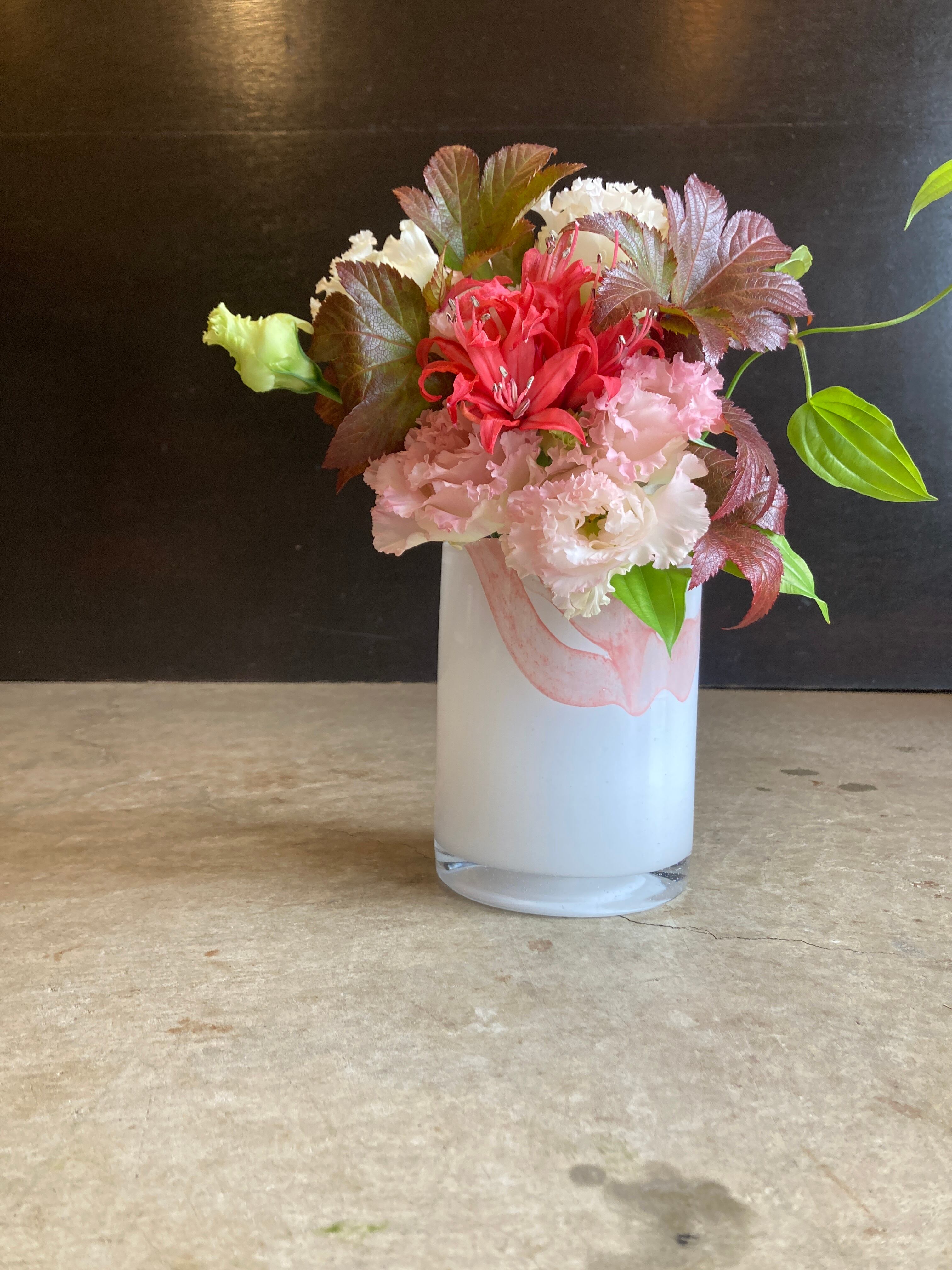 白いベースに華やかなピンクのリボンを纏うかのようなアクアレルピンクは華やかなお花を生けても花瓶だけ目立つようなことなくそれを引き立て、シンプルな葉物や枝ものを生けても模様のおかげで華やかさをプラスしてやはり植物を引き立てます。